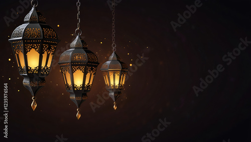 hanging shining arabic lanterns on dark background for ramadan kareem