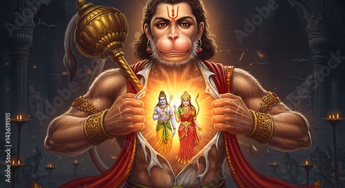 rama, devotion, hinduism, mythology, indian, deity, strength, loyalty, spiritual, divine, powerful, courageous, monkey, god, belief, worship, religious, hindu, nubes, chest, revealing, faith, love, respect, tradition, culture, temple, architecture, glowing, bright, ornate, gold, background, ancient, traditional, spirituality, sculpture, figure, mythical, artwork, illustration