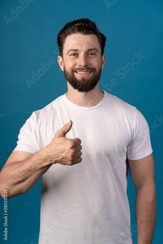 happiness, gesture and people concept - smiling man showing thumbs up. Portrait of a handsome man.