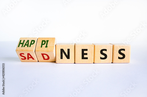 Happiness or sadness symbol. Turned cubes and changed the word 'sadness' to 'happiness'. Beautiful white background. Business, psychological and happines or sadness concept. Copy space.