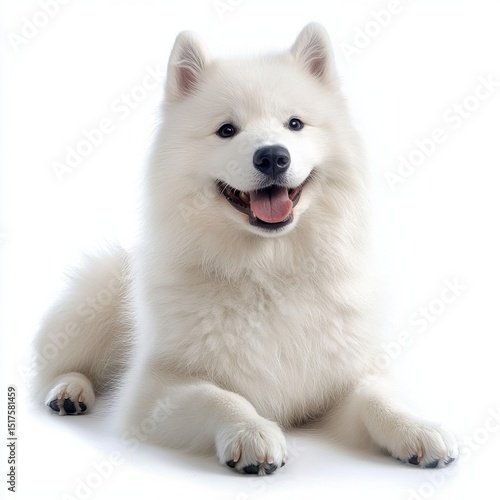 Happy adorable fluffy white dog with black eyes and nose lying down on white background with cheerful expression and tongue out