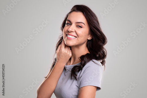 woman, smile, beauty, happy, make-up, skincare, brunette, style, confident, female, adult, long hair, human face, charming, positive, model, lady, content, elegant, appearance, feminine, cosmetic, complexion, honed, satisfied, cosmetology, pamper, pleasant, enjoy, carefree, fashion, facial, visage, toothy smile, well-being, grey background, studio shot, isolated