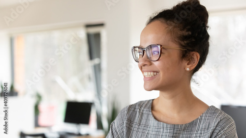 Happy African American business woman wearing trendy glasses, posing in office, looking away. Head shot of confident female company owner dreaming of future success and achievements. Close up portrait
