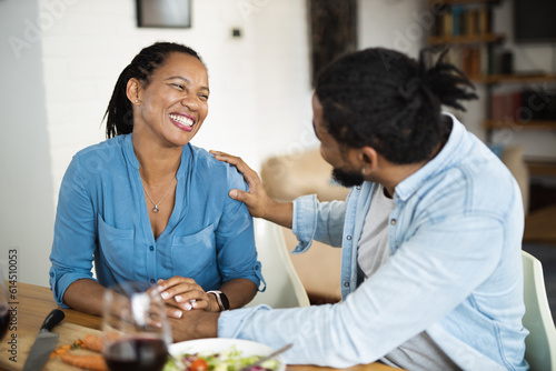 happy, african american, couple, talking, enjoyment, lunch, dining table, communication, smiling, black people, adult, adults only, african ethnicity, bonding, breakfast, casual clothes, dating, domestic life, eating, ethnicity, female, food, friendship, home interior, horizontal, husband, indoor, avocation, lifestyle, male, man, meal, morning, people, photo, human relationships, salad, sitting, table, togetherness, two people, wife, woman, young, young men