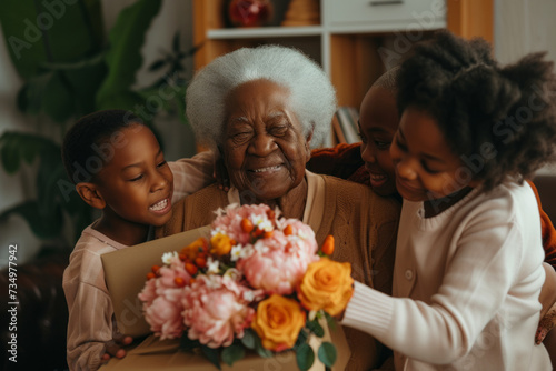grandmother, present, african american, gift, love, family, birthday, happy, surprise, bouquet, children, flower, girl, smile, grandchild, card, grandson, granddaughter, greeting, give, man, woman, home, holiday, couch, old, senior, to sit, together, sofa, celebration, anniversary, receive, mature, wife, lifestyle, little, boy, mother, grandparent, smiling, celebrate, daughter, elderly, joy, giving, african, black woman