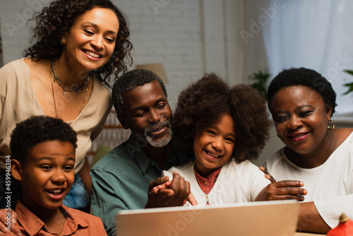 happy african american man pointing at laptop near cheerful family on thanksgiving day