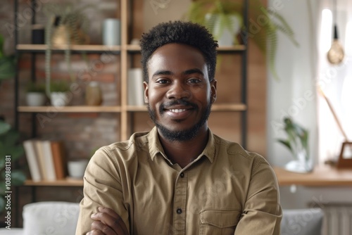 Happy African American man poses for headshot at home office.