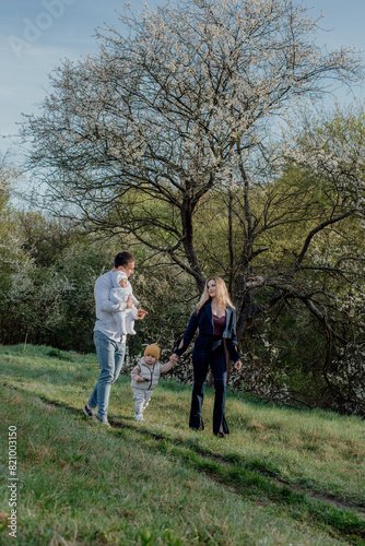 happy and cheerful young family with two kids enjoying spring sun outdoors. Young parents with kids playing outdoors