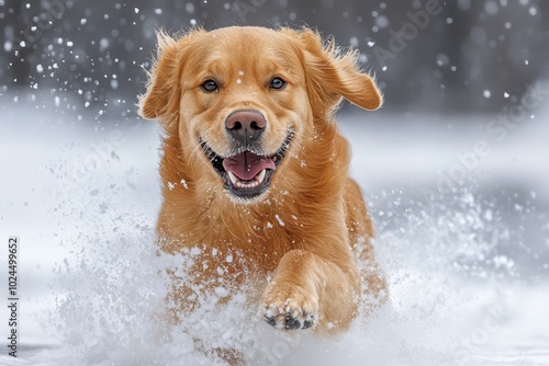 Happy and Playful Golden Retriever Running in the Snow, Mouth Open to Catch Falling Snowflakes, Professional Photography Style