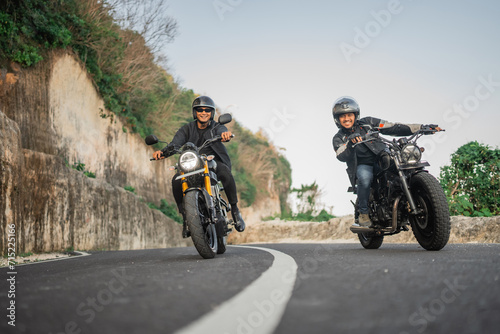 happy asian bikers riding motorcycle together, leisure activity concept