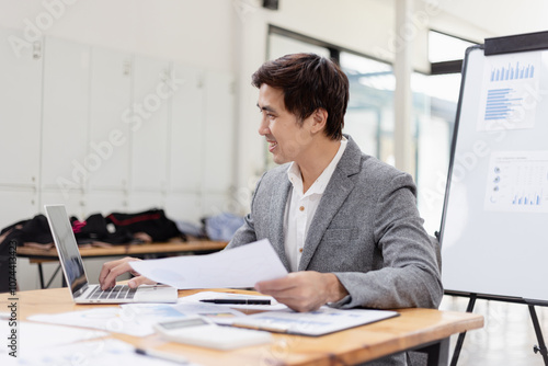 Happy asian businessman working at desk in office, Excited male person, Employee in achievement,