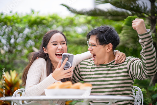 Happy Asian couple meet gladness, win or do something success at backyard, People have conversation, share laugh and smile outdoor. Healthy life and insurance concept. Marriage drink coffee in garden.