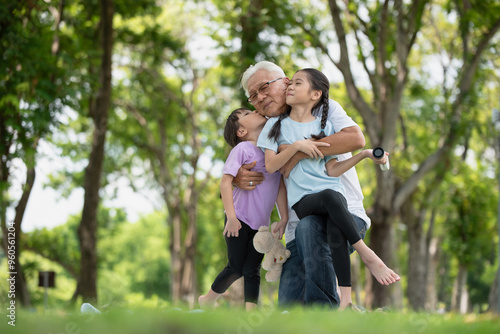 Happy Asian family children having fun and kissing her grandfather on the cheek in the park