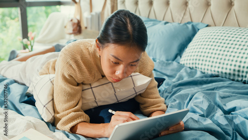 Happy Asian girl university with white cream pajamas lay down on fluffy comfort bed use digital tablet learning online in bedroom at home. Revisualizing flexible working, Work from home concept.