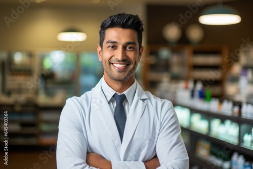 Happy Asian Indian male pharmacist standing in pharmacy