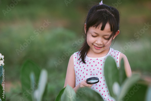 Happy asian little child girl looking through a magnifying glass on green leaf tree in the park