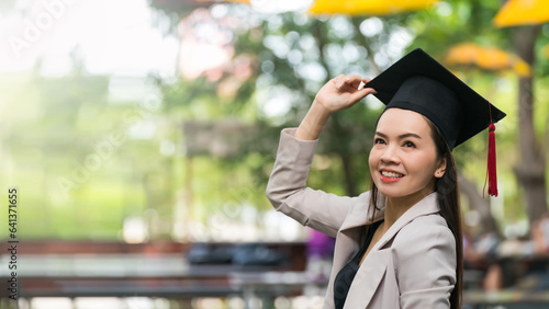 Happy Asian matured beautiful university graduate wearing black cap with red tassels