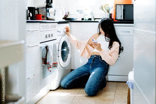 Happy Asian teen girl holding smart phone using digital technology in kitchen Smiling young woman using apps, shopping online, reading news, browsing internet on sofa