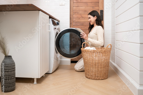 Happy Asian young woman is doing laundry in home , healthy lifestyle concept
