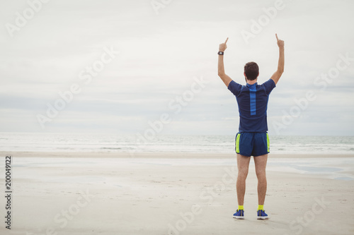 20s, young adult, man, male, caucasian, athlete, athletic, energy, exercise, fitness, health, healthy, lifestyle, activity, joy, challenge, succeed, winner, success, successful, celebration, competition, excitement, skill, victory, pride, record, determination, swimmer, swim, sand, watch, walking, activewear, sky, seacoast, sport, sporty, sharpened, beach, water, sea, ocean, training