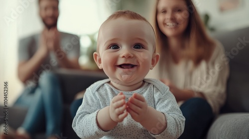 baby, infant, toddler, children, happy, smiling, joyful, mother, father, family, home, couch, living, room, interior, sitting, background, blurry, out, sharpened, closeup, portrait, cute, adorable, sweet, cheerful, playful, love, affection, care, warmth, togetherness, bonding, happiness, contentment, innocence, purity, small, tiny, little, precious, delightful, expression, face, eye, hand, soft