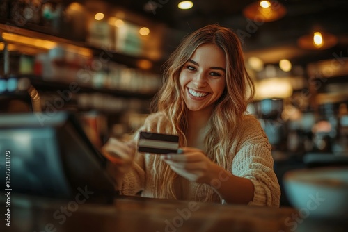 Happy barista getting a credit card payment from a customer, Generative AI