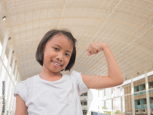 Happy Beautiful asian kids with drawn muscles. Girl power and feminism concept. Sport concept. Strong superhero child.