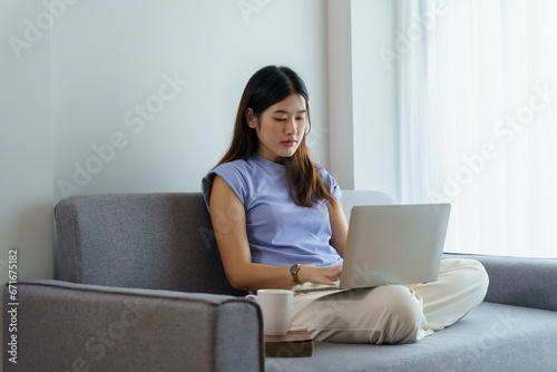 Happy beautiful Asian Woman. Business woman working from home with laptop Financial Home work space concept.