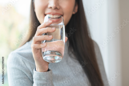 Happy beautiful, asian young woman, girl drinking, sip fresh glass of water for hydration of body, holding transparent glass in her hand, thirsty at home. Health care, healthy lifestyle concept.
