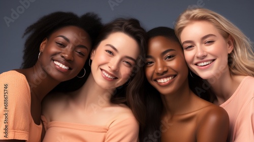 Happy, beautiful, diverse, and inclusive women who take pride in their varied skin tones and backgrounds in the studio. Multicultural models for empowerment, skincare, and glow.