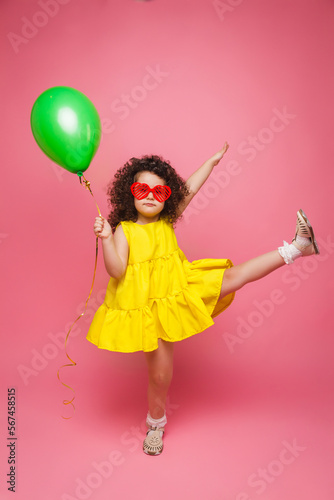 Happy birthday celebration with flying balloons of a charming cute little girl in a yellow dress isolated on a pink background.