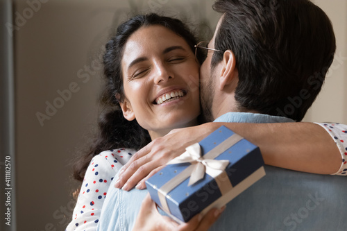 Happy birthday, my love. Rear view of tender young husband greeting touched wife with important date. Grateful millennial woman embracing with warmth beloved man holding gift box with present surprise