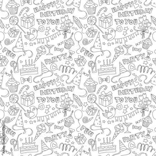 Happy birthday party doodle black and white seamless pattern