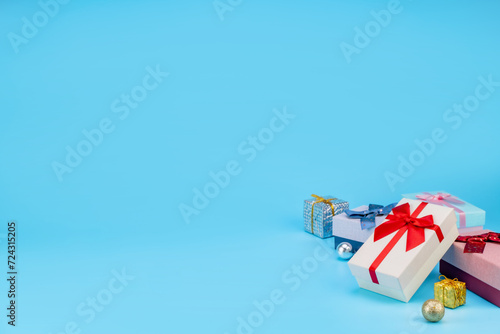 Happy birthday setup concept. Top view, Gift boxes in many colors Many boxes for birthday parties and celebrations, everyone is happy, and more on light blue background with space for text.