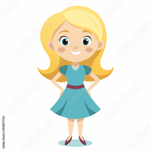 happy blond girl, blonde hair girl, smiling girl, cheerful child, joyful girl, girl in dress, cute girl, full body girl, full-length girl, standing girl, cartoon girl, child character, blond kid, whit