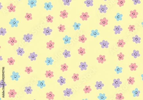 flower, pastel, yellow, pink, blue, purple, smiley, happy, cute, pattern, background, design, textile, fabric, wallpaper, illustration, art, cheerful, bright, simple, whimsical, floral, repeat, surface, pretty, childish, playful, sweet, innocent