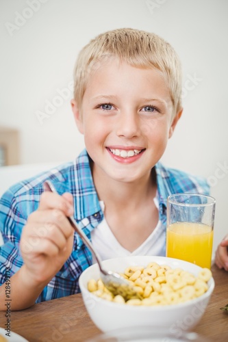 Happy boy having breakfast at table in house