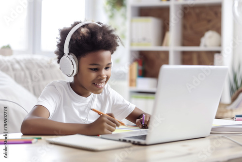 boy, learning, online, education, smiling, happy, earphones, laptop, virtual, school, children, student, technology, e-learning, joy, engagement, remote, homework, african american, study, concentration, digital, youth, cyberspace, cognition, cheerful, enthusiasm, distance learning