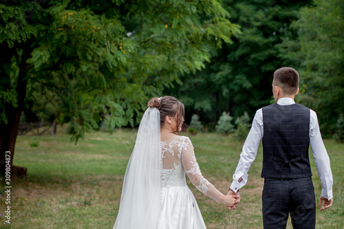 Happy bride and groom holding hands and walking in garden wedding day. Back view of charming stylish newlyweds holding hands while walking in park forest, happy marriage moments