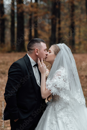 Happy bride and groom on their wedding. Groom and bride kissing. Portrait of the bride. Newlyweds in the park. Happy couple. Wedding photo. Couple in love. Autumn wedding