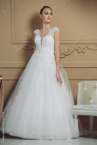Happy bride in luxury sparkly wedding dress posing in studio on brown background. Marriage concept.
