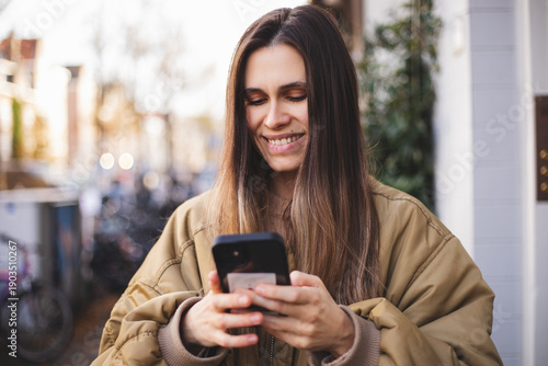 Happy brunette woman in stylish bomber jacket smiling while looking at smartphone outdoors, enjoying social media, texting, and modern urban lifestyle