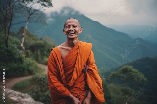 Happy Buddhist Monk in the Mountains - Smiling - AI Generated