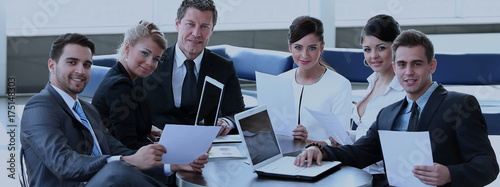 Happy business colleagues at work smiling to camera