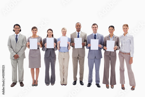 20s, young adult, man, male, black, 30s, hispanic, woman, female, caucasian, 19, white background, copy space, teamwork, businessperson, cheerful, colleague, happy, well-dressed, front view, full-length, portrait, positive, professional, smiling, togetherness, standing, studio shot, side by side, holding, signs