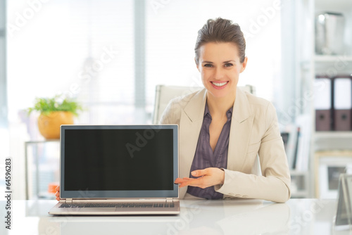 business, businesswoman, woman, employee, entrepreneur, showing, show, screen, blank, laptop, notebook, display, electronic mail, information, info, communication, cyberspace, network, technology, wireless, service, happy, gladness, smiling, smile, suit, costume, office, workplace, female, lady, work, manager, executive, modern, caucasian, white