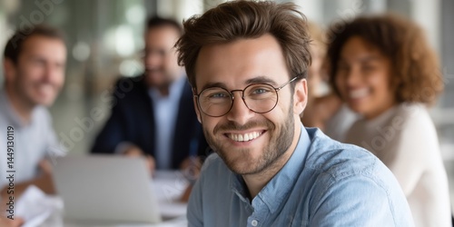 Happy businessman in a meeting, business colleagues smiling, office setting. Use Stock photo for business, teamwork, success
