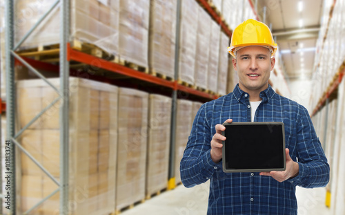 happy businessman with tablet pc at warehouse