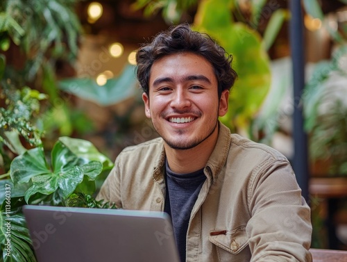 businessman, office, working, happy, casual attire, attire, laptop, indoor, environment, potted, plant, smiling, man, workspace, sitting, looking, camera, professional, workplace, business, positive, vibe, friendly, face, setting