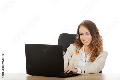 Happy businesswoman working on laptop.